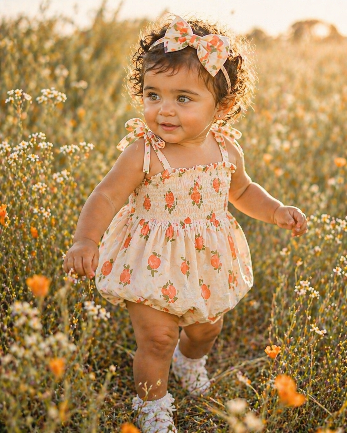 The sweetest little peachy print for sunny days. Georgia Peach is a smocked romper with adjustable tie straps and an easy, breezy fit that looks darling and feels even better. The fabric appears to be a soft, airy cotton gauze feel (double gauze muslin vibes), perfect for warm weather and all-day comfort. Finished with bottom snaps and a matching bow headband.